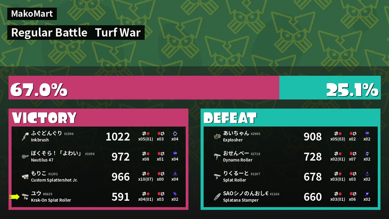 | Medals | #1 Kraken Royale User #2 Home-Base Inker #2 Splat Assister | ||
