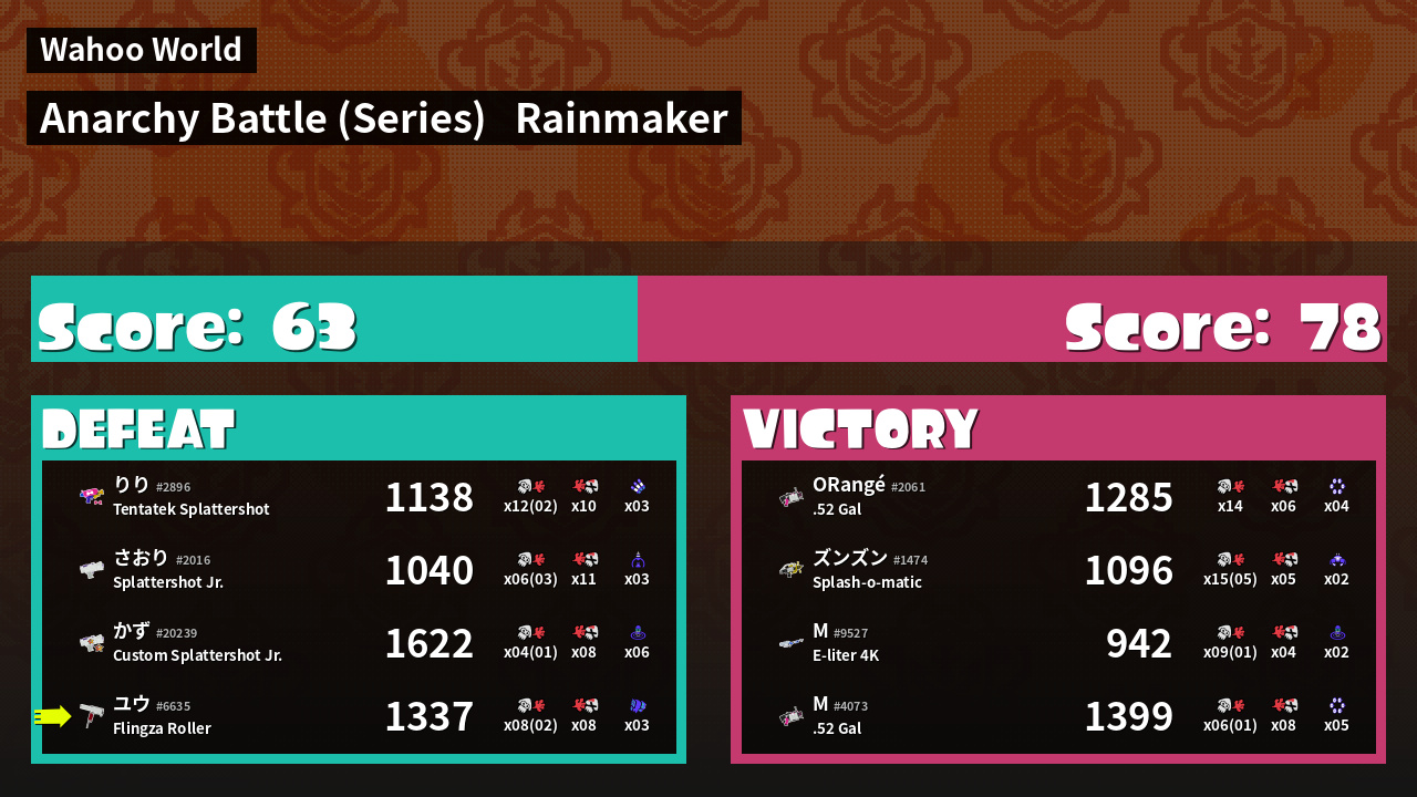 | Medals |  #1 Rainmaker Stopper  #2 Overall Splatter  #2 Score Booster | ||