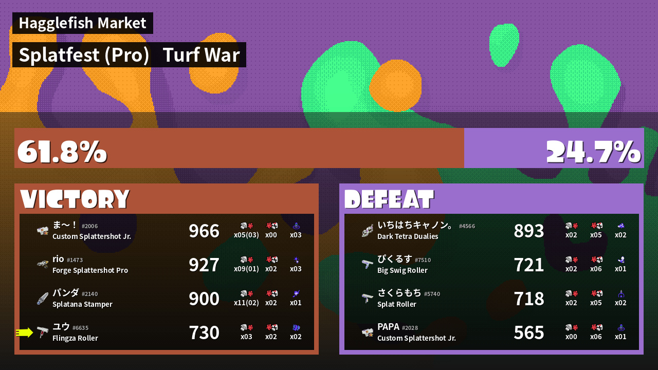 | Splatlandian Youth さくらもち #5740 |  Splat Roller                    | 718 | 2 + 0 | 5 | 0.40 |  2 | |