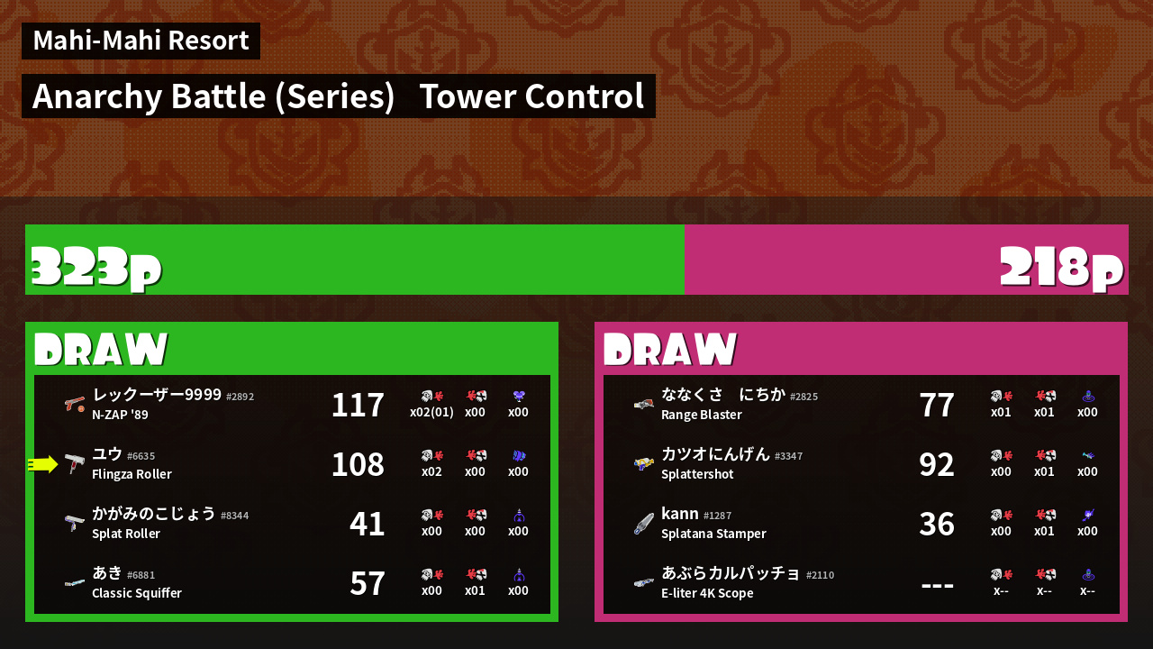 | Partying Leadoff Hitter  カツオにんげん #3347 |  Splattershot                    | 92 | 0 + 0 | 1 | 0.00 |  0 | |
