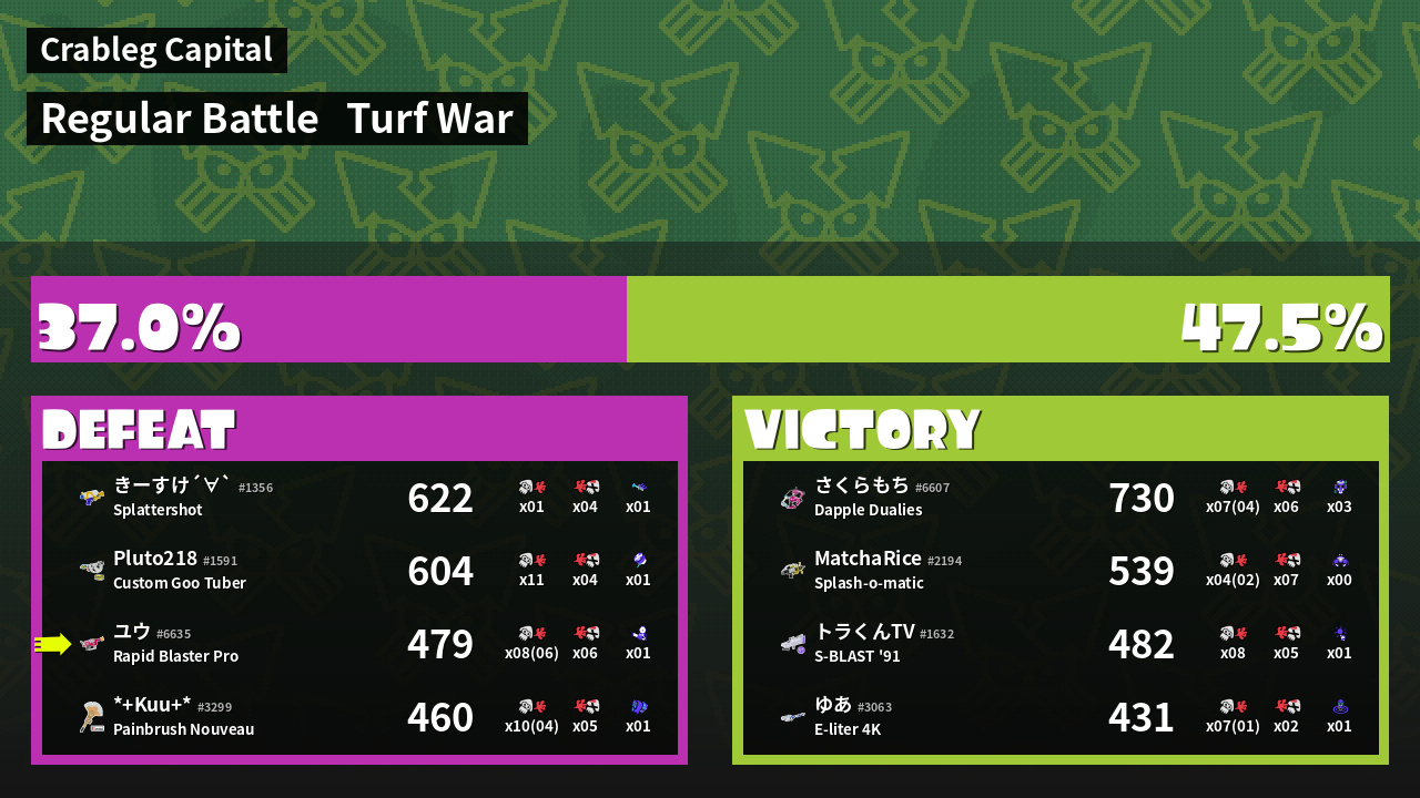 | Medals | #1 Enemy-Base Inker #1 Splat Assister #1 Ink Consumer | ||
