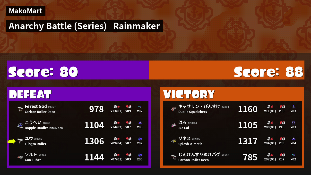 | Medals | #1 Turf Inker #1 Splat Assister #1 Checkpoint Breaker | ||