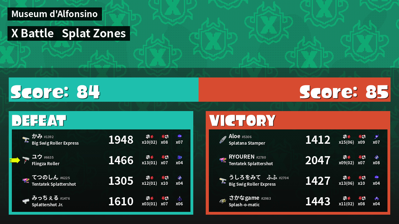 | Medals | #1 Overall Splatter #1 Enemy Splatter #1 Tenta Missiles User | ||
