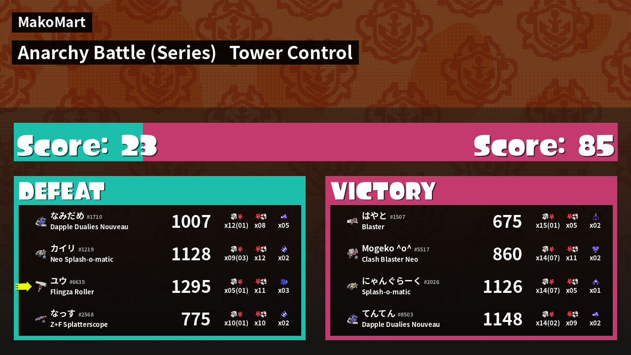 | Medals | #1 Turf Inker #1 Tenta Missiles User #2 Splat Assister | ||