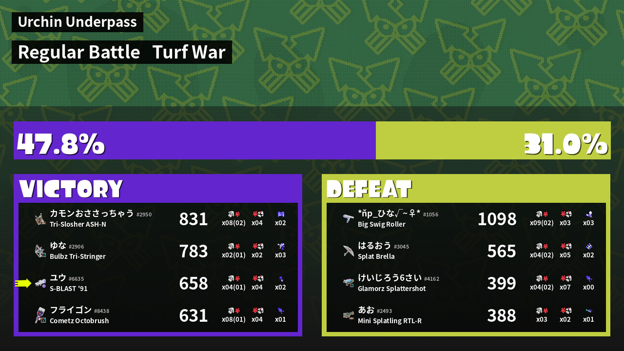 | Medals | #1 Enemy-Base Inker #2 Super Jump Spot #2 Splat Assister | ||