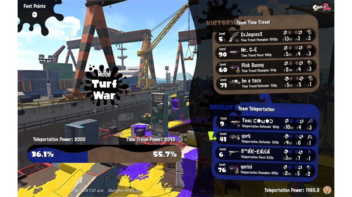 | Splatfest Title | Teleportation Defender 230 → Teleportation Defender 250 | |||||||||||||||||||||||||||||||