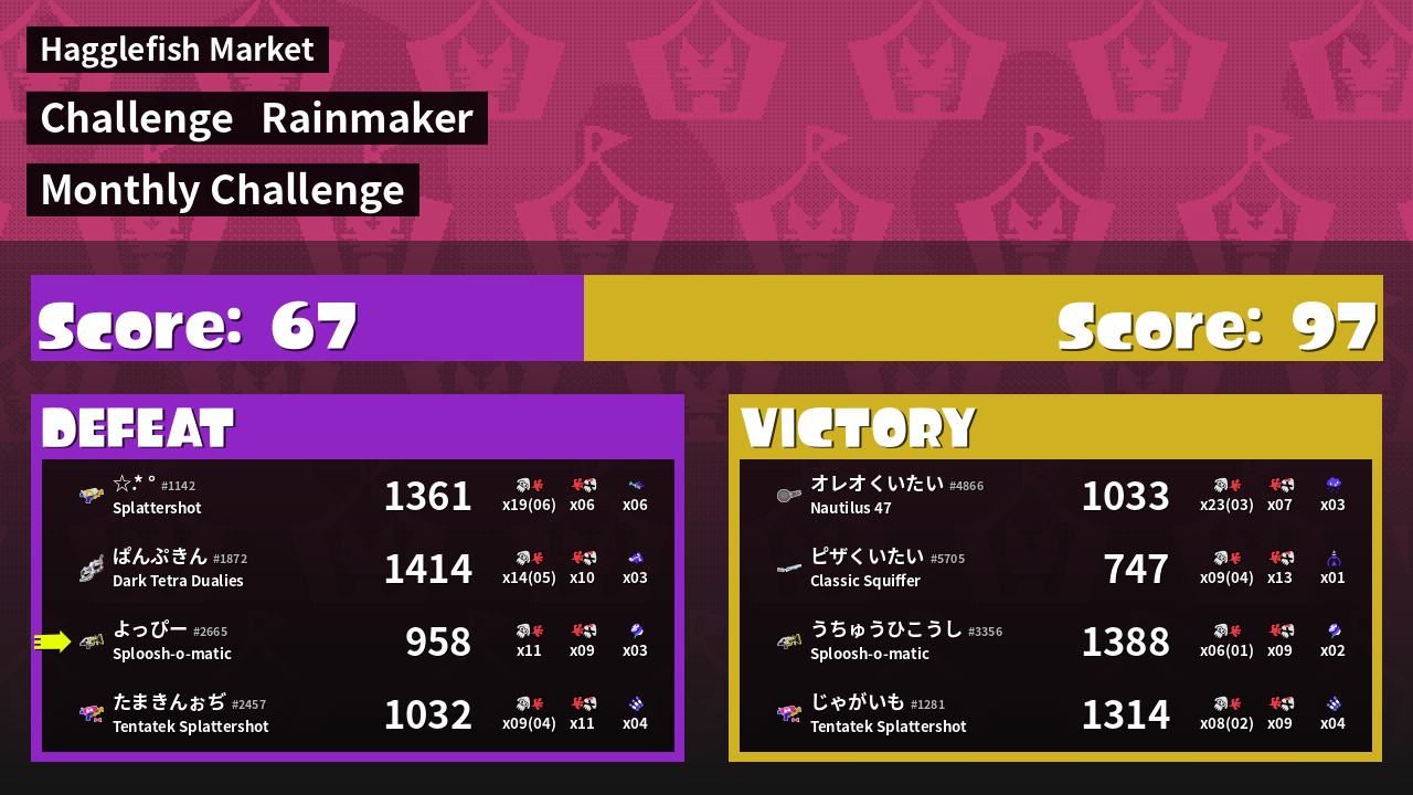 | Weapon | Sploosh-o-matic ( Curling Bomb / Ultra Stamp) | ||