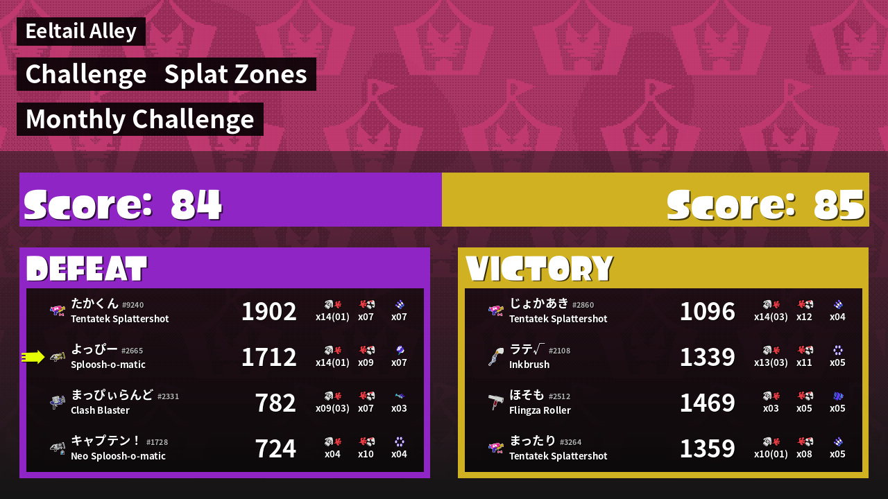 | Medals | #1 Overall Splatter #1 Splat Zone Inker #1 Splat Zone Guard | ||