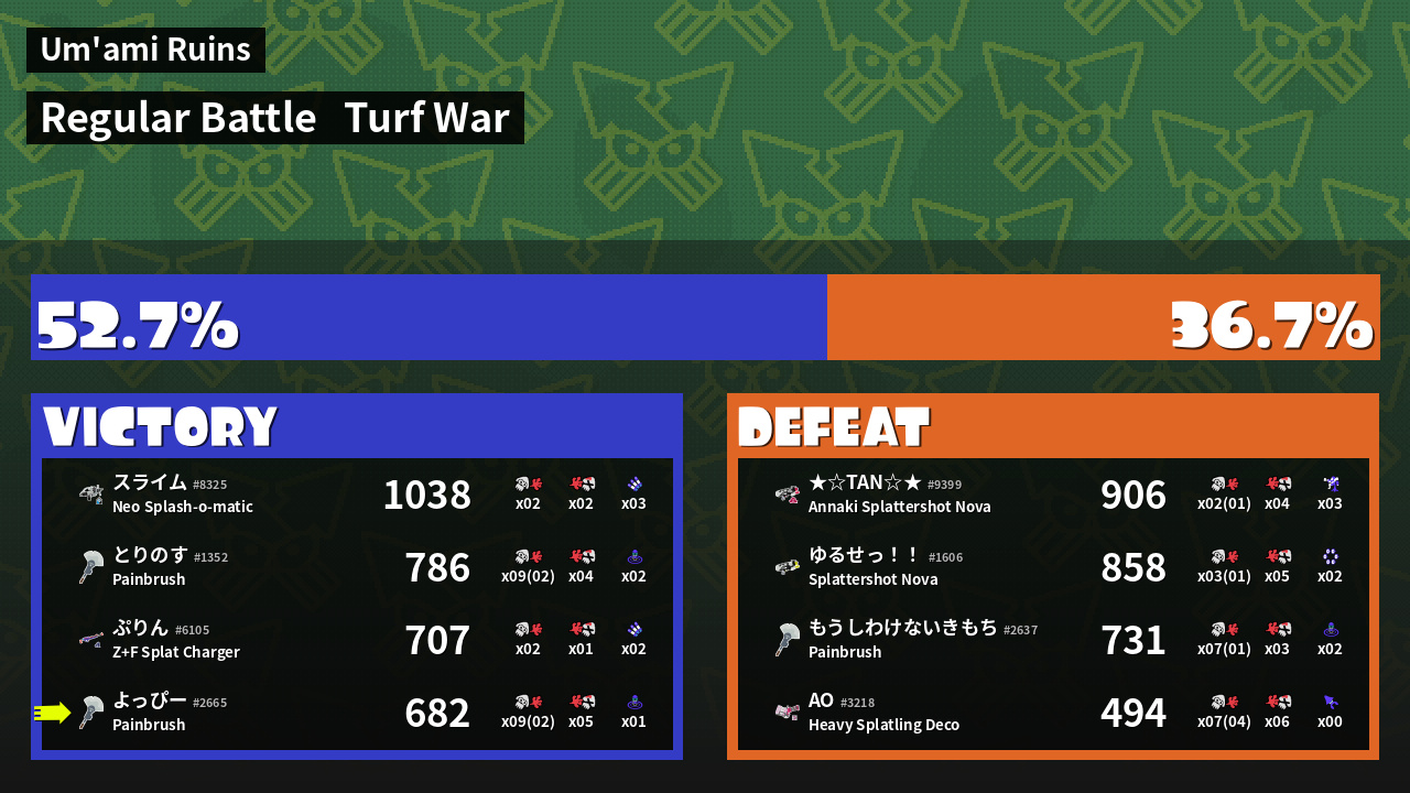 | Medals | #1 Overall Splatter #1 Popular Target #1 Enemy-Base Inker | ||