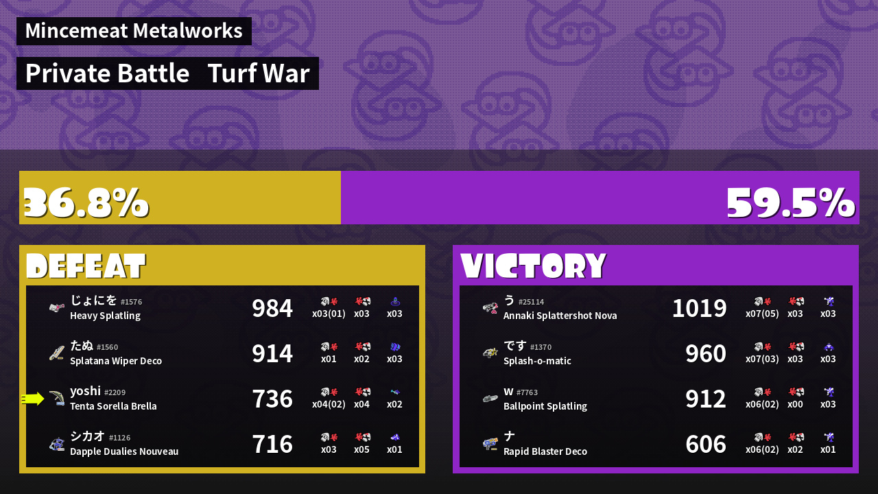 | Medals | #1 Overall Splatter #1 Enemy-Base Inker #1 Splat Assister | ||