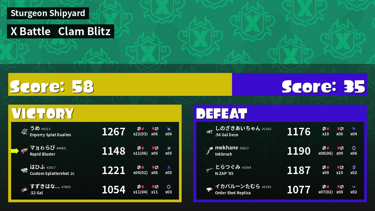 | Medals | #1 Super Jump Spot #1 Splat Assister #1 Clam Stopper | ||