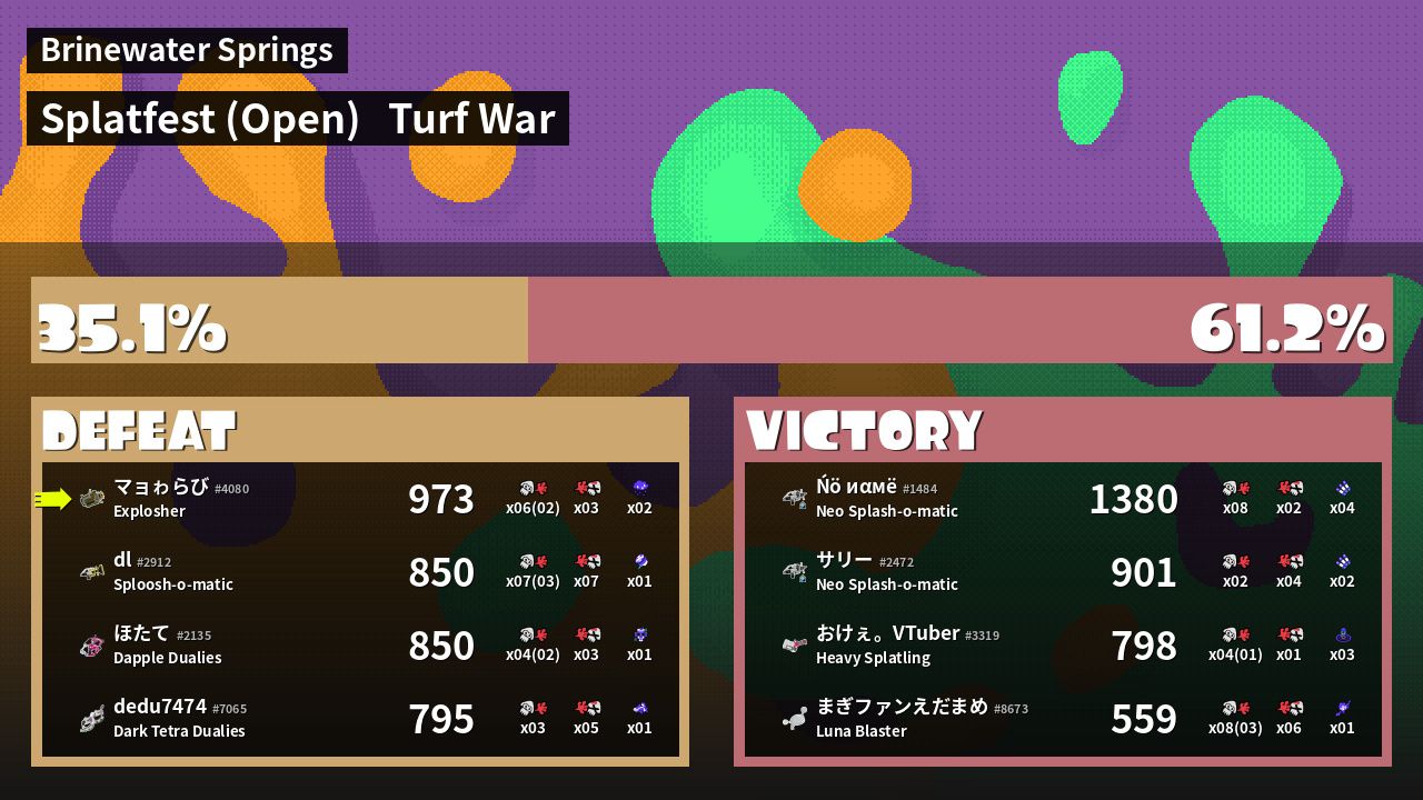 | Medals | #1 Turf Inker #1 Enemy Splatter #1 Ink Consumer | ||