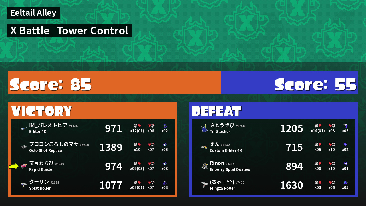 | Medals | #1 Splat Assister #1 Tower Stopper #1 Triple Inkstrike User | ||