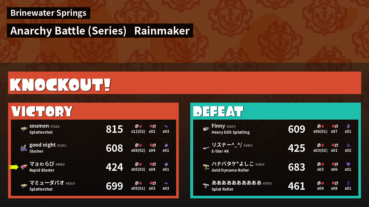 | Medals | #1 Splat Assister #1 Rainmaker Carrier #1 Rainmaker Stopper | ||
