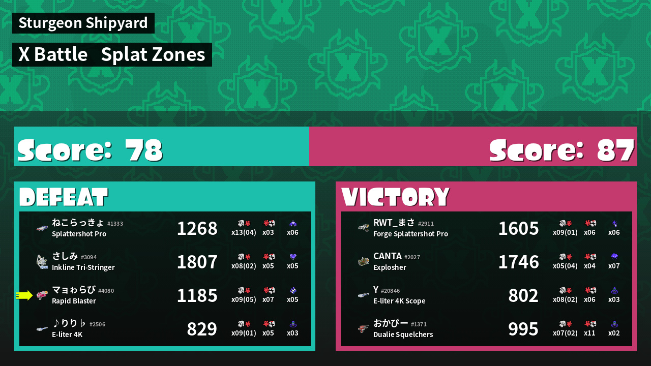 | Medals | #1 Splat Zone Guard #1 Splat Assister #1 Splat Zone Hero | ||