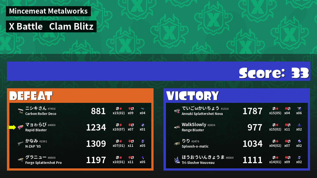 | Mode | Clam Blitz - X Battle | ||