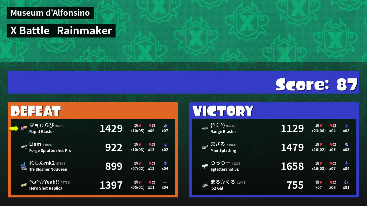 | よくばりなシオカラーズファン  Liam #1906 |  Forge Splattershot Pro                    | M | 922 | 7 + 3 | 13 | 0.54 |  2 | |