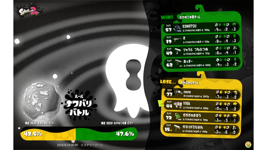 | Splatfest Title | きのこの山 Fangirl 9 → きのこの山 Fiend 1 | |||||||||||||||||||||||||