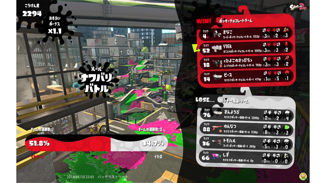 | Splatfest Title | ポッキーチョコレート Fiend 238 → ポッキーチョコレート Defender 54 | ||||||||||||||||||||||||||||