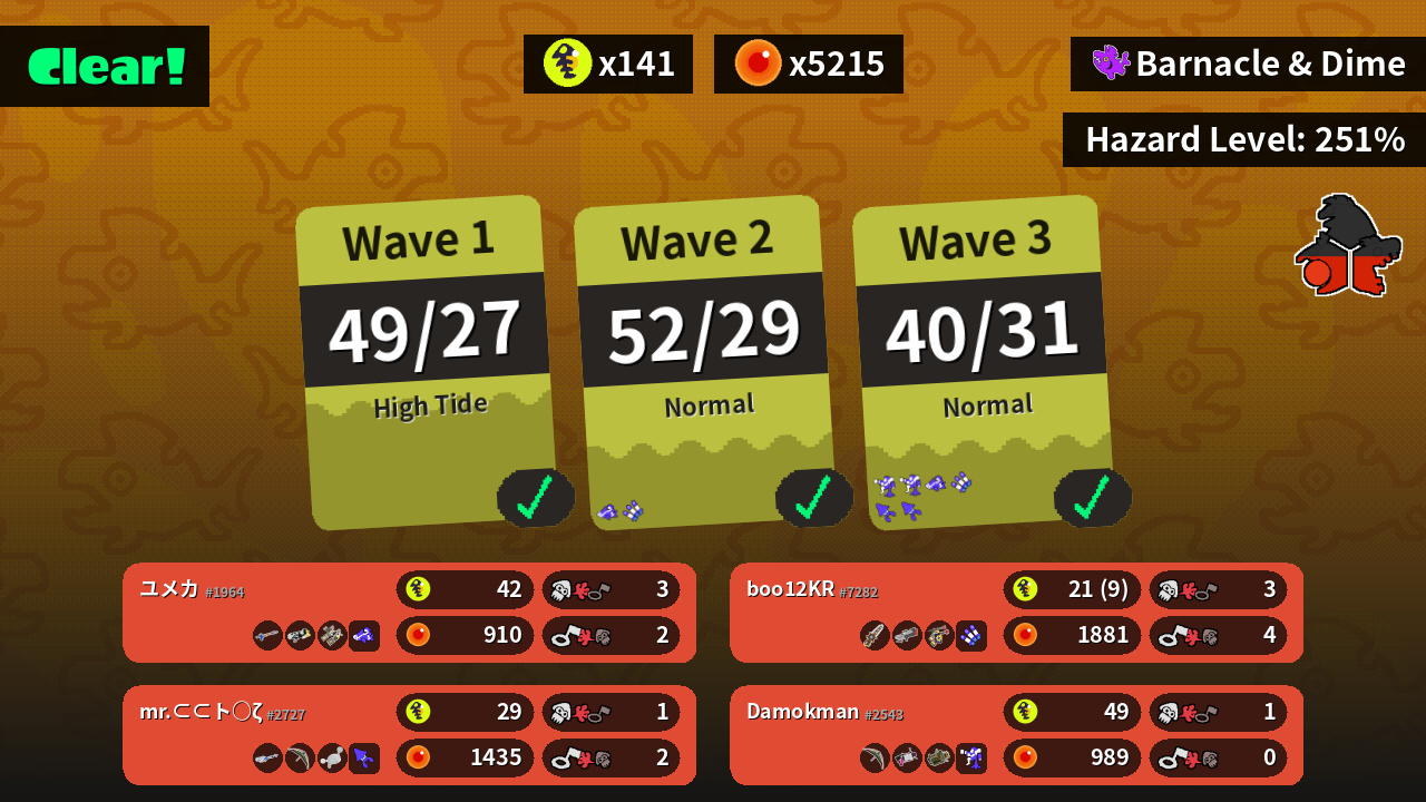 | Weapons | Snipewriter 5H Splattershot Nova Grizzco Dualies | Tenta Brella .52 Gal Explosher | E-liter 4K Tenta Brella Luna Blaster | Grizzco Splatana S-BLAST '92 Douser Dualies FF |