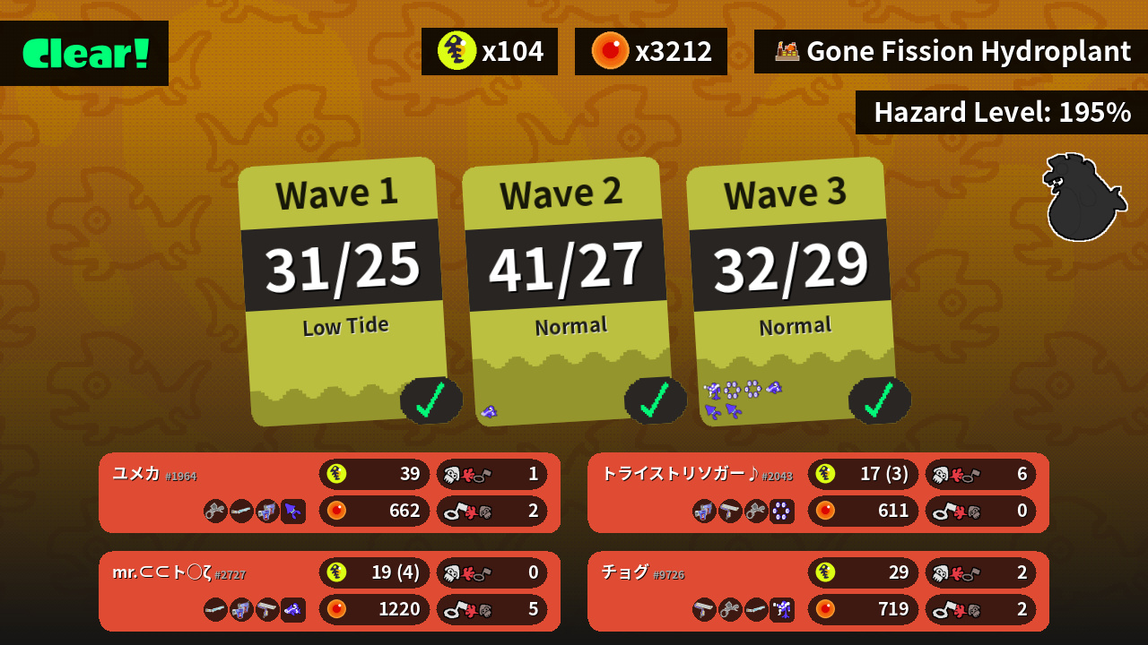 | Weapons | Aerospray MG Classic Squiffer Glooga Dualies | Splat Roller Aerospray MG Classic Squiffer | Classic Squiffer Glooga Dualies Splat Roller | Glooga Dualies Splat Roller Aerospray MG |