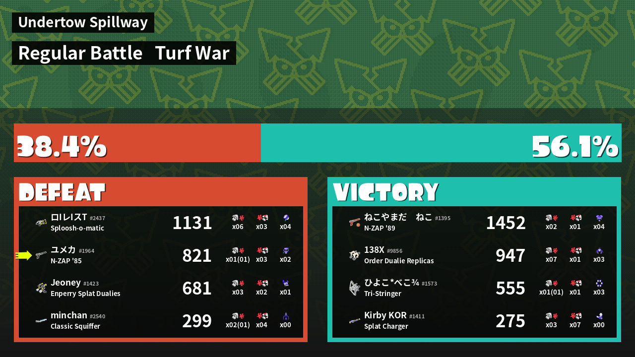 | Medals | #1 Home-Base Inker #1 Splat Assister #1 Tacticooler User | ||