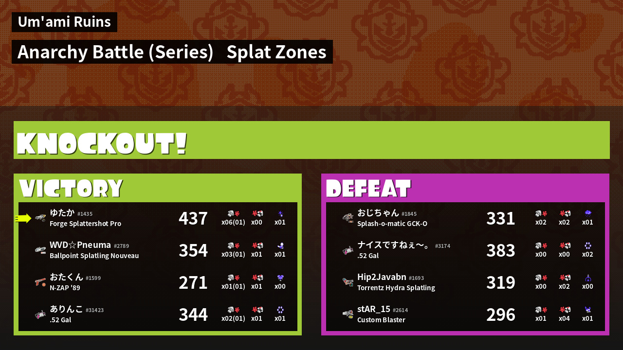 | Medals | #1 Overall Splatter #1 Splat Zone Guard #1 Turf Inker | ||