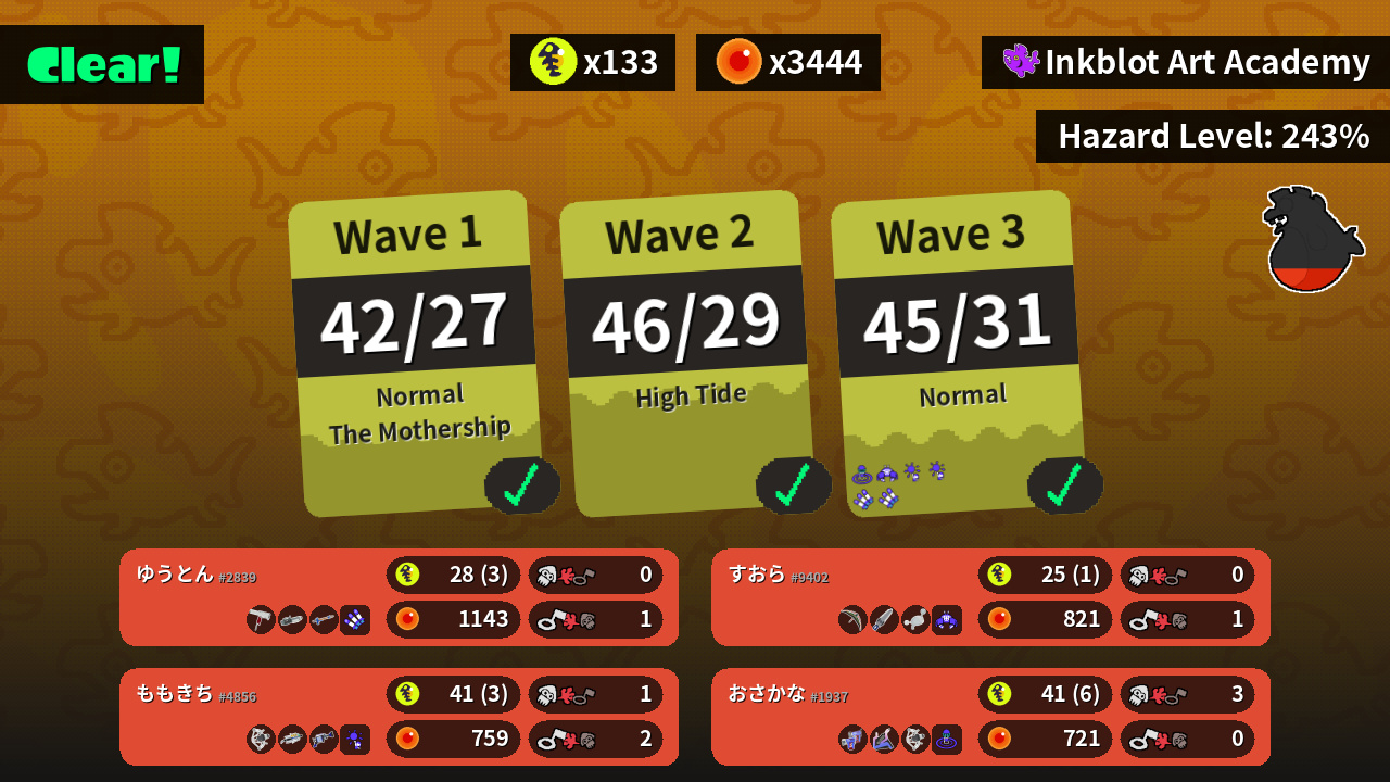 | Weapons | Flingza Roller Ballpoint Splatling Snipewriter 5H | REEF-LUX 450 Grizzco Brella H-3 Nozzlenose | Glooga Dualies Slosher REEF-LUX 450 | Tenta Brella Splatana Stamper Luna Blaster |