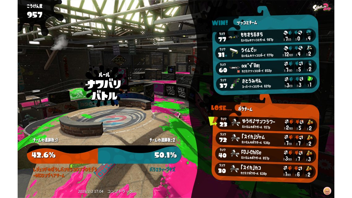 | Team ツッコミ バラエティーブキズ Win Streak: 2 | 3,447 | 25 / 12 | 2.08 67.57% | ||||