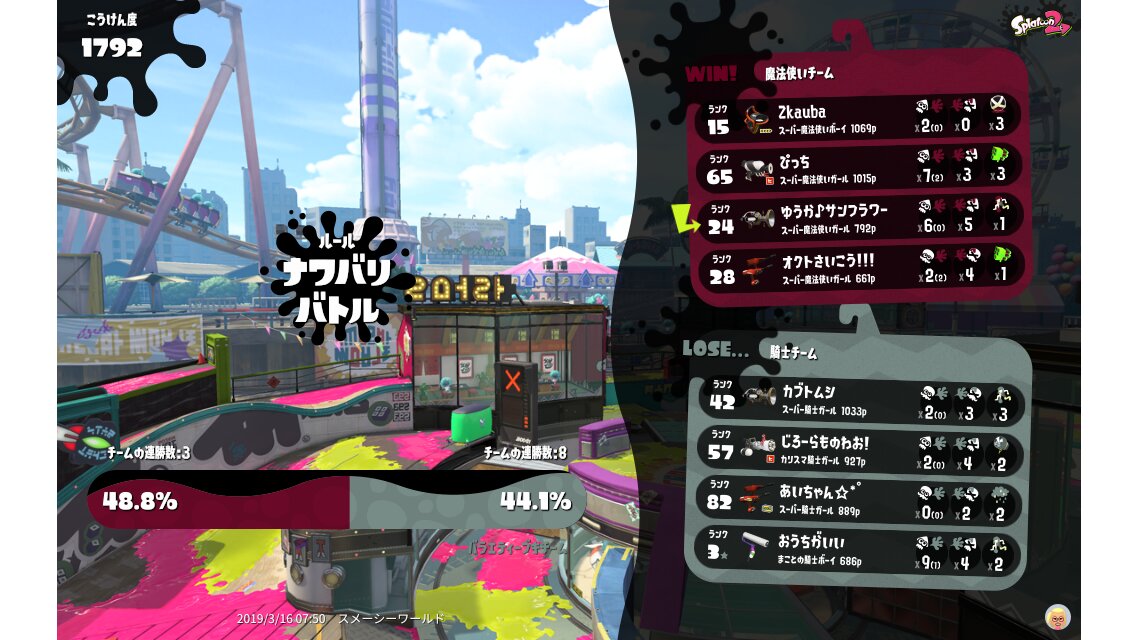 | Team 騎士 バラエティーブキチーム Win Streak: 8 | 3,535 | 12 / 13 | 0.92 48.00% | ||||