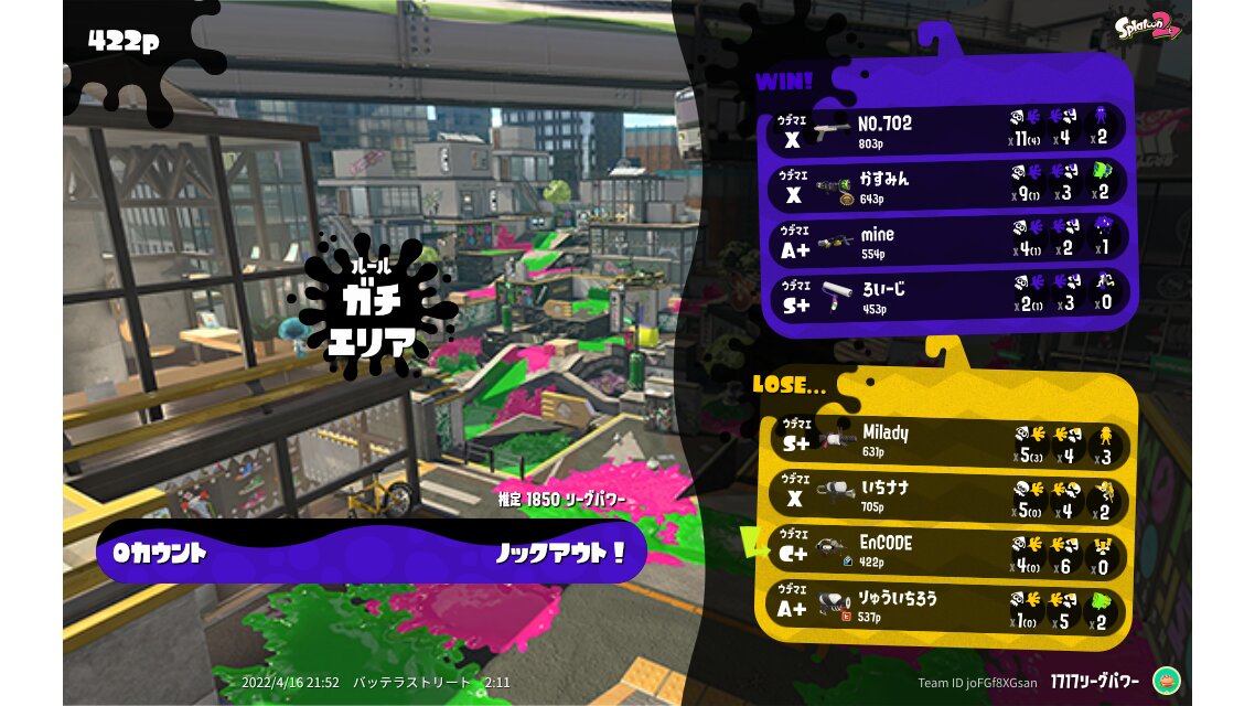 | Mode | Splat Zones - League Battle (Quad) | |||||||||||||||||||||||||||||||
