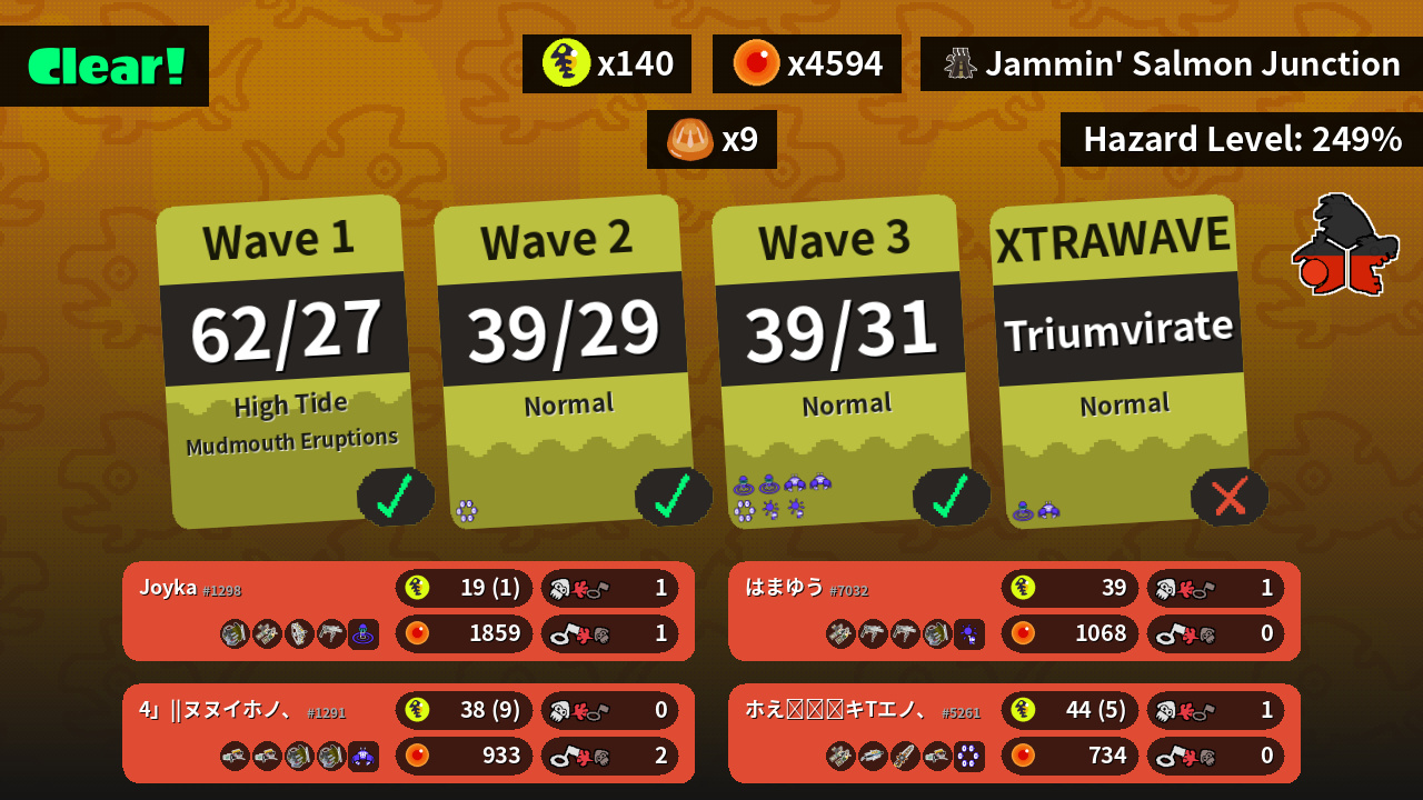 | Weapons | Grizzco Slosher Grizzco Dualies Grizzco Stringer Grizzco Roller | Grizzco Dualies Grizzco Brella Grizzco Splatana Grizzco Blaster | Grizzco Dualies Grizzco Roller Grizzco Roller Grizzco Slosher | Grizzco Blaster Grizzco Blaster Grizzco Slosher Grizzco Slosher |