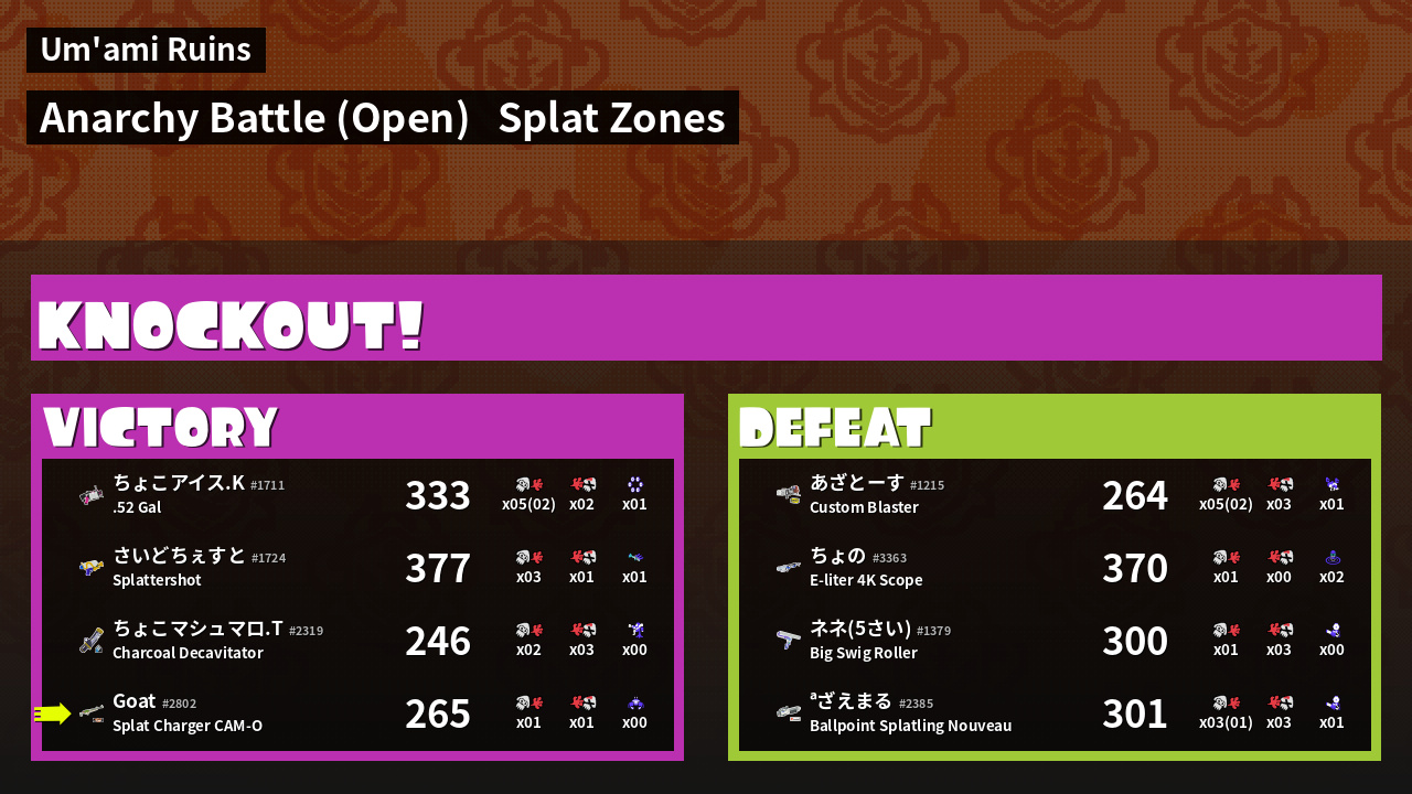 | Mode | Splat Zones - Anarchy Battle (Open) | ||