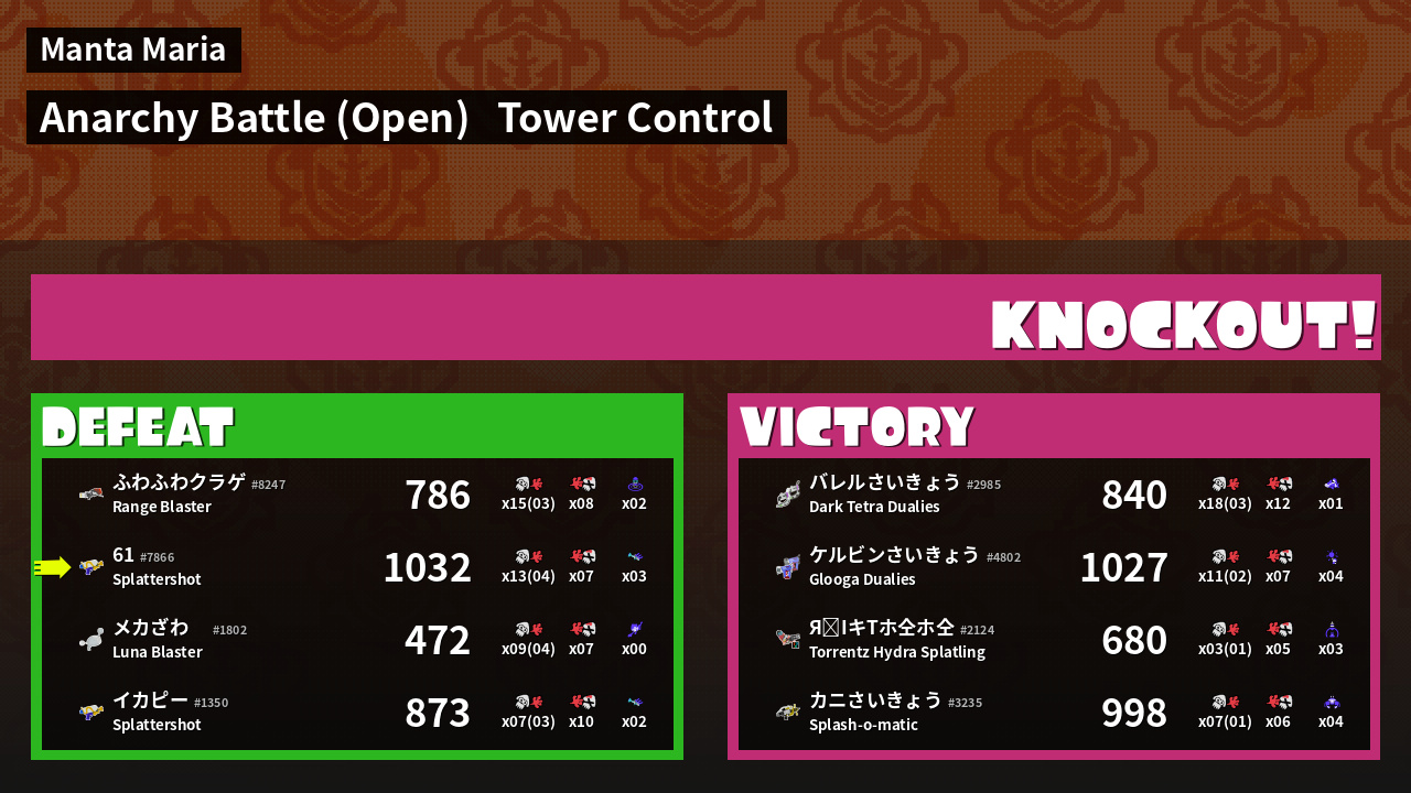 | Medals | #1 Turf Inker #1 Splat Assister #1 Tower Stopper | ||