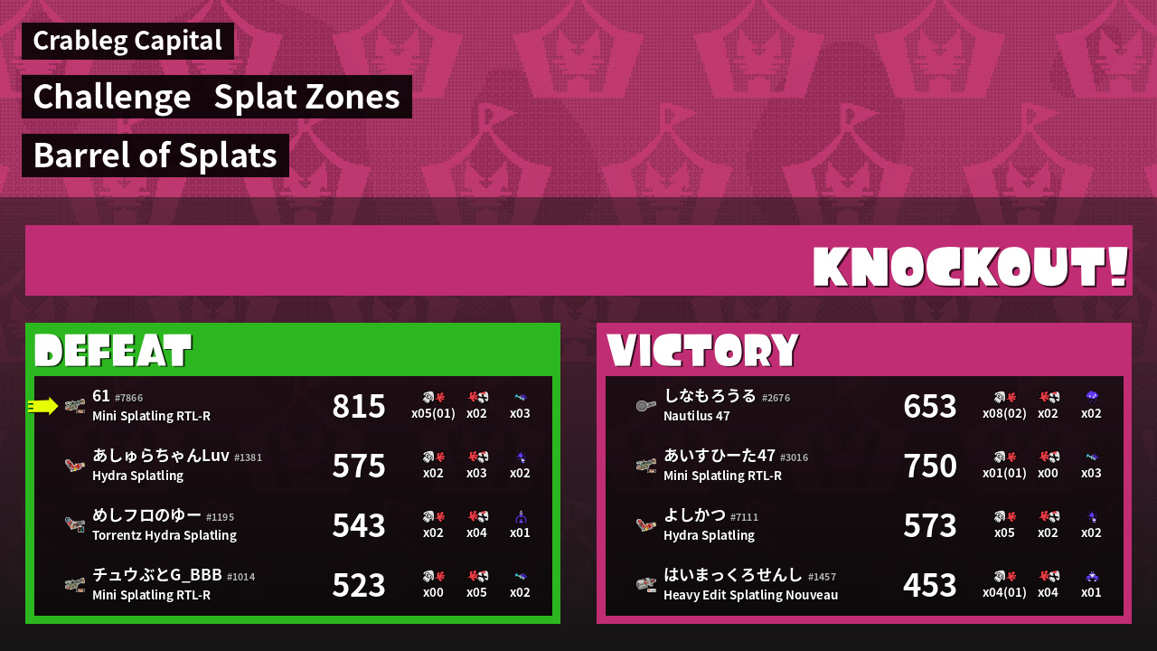 | Challenge | Barrel of Splats Muster as much firepower as you can<br />in this battle of the splatlings! | ||