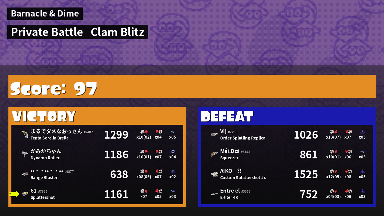 | Mode | Clam Blitz - Private Battle | ||