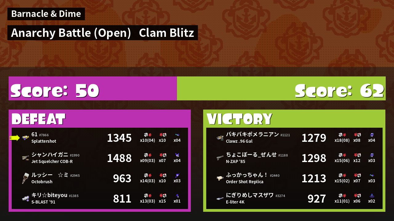 | Mode | Clam Blitz - Anarchy Battle (Open) | ||