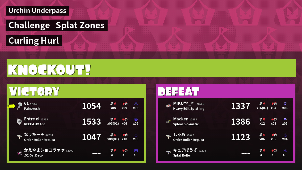 | Medals | #1 Overall Splatter #1 Splat Zone Guard #1 Enemy Splatter | ||