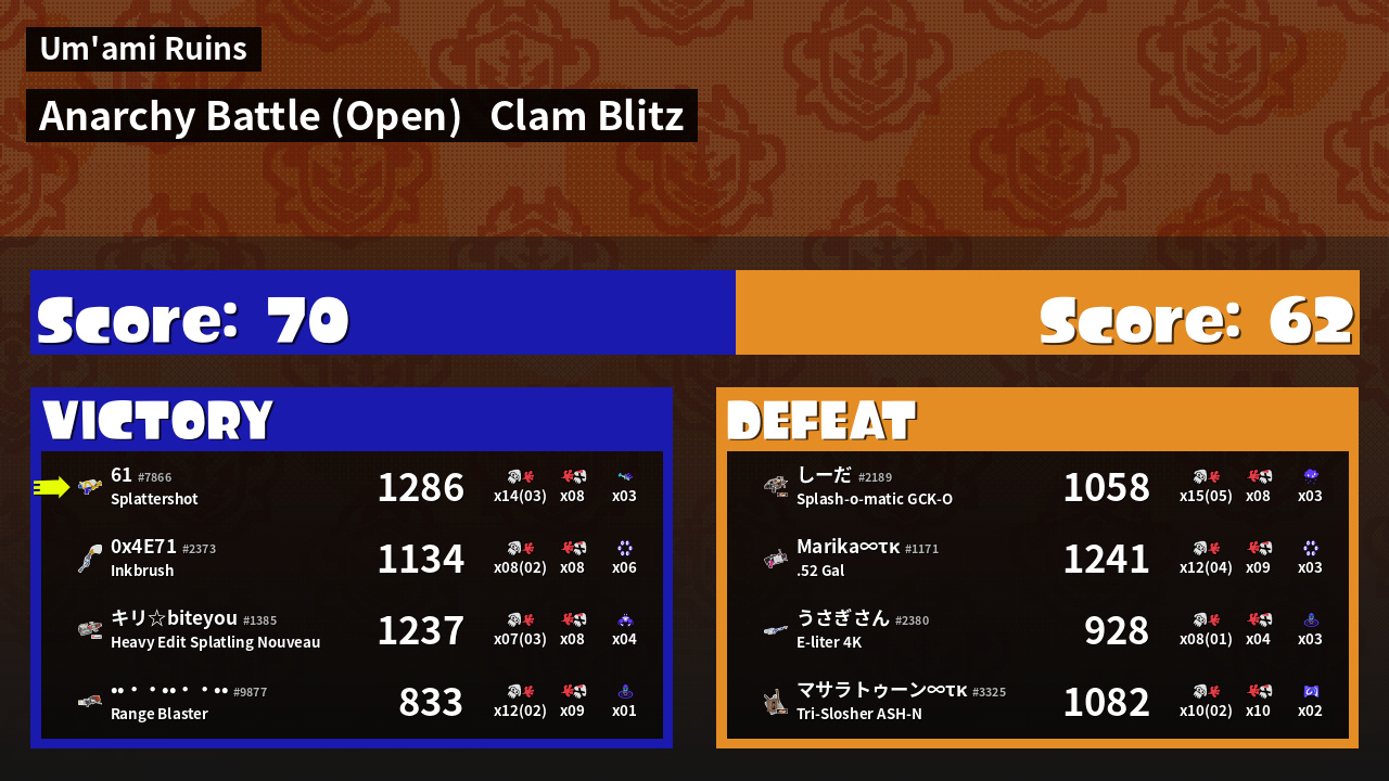 | Mode | Clam Blitz - Anarchy Battle (Open) | ||