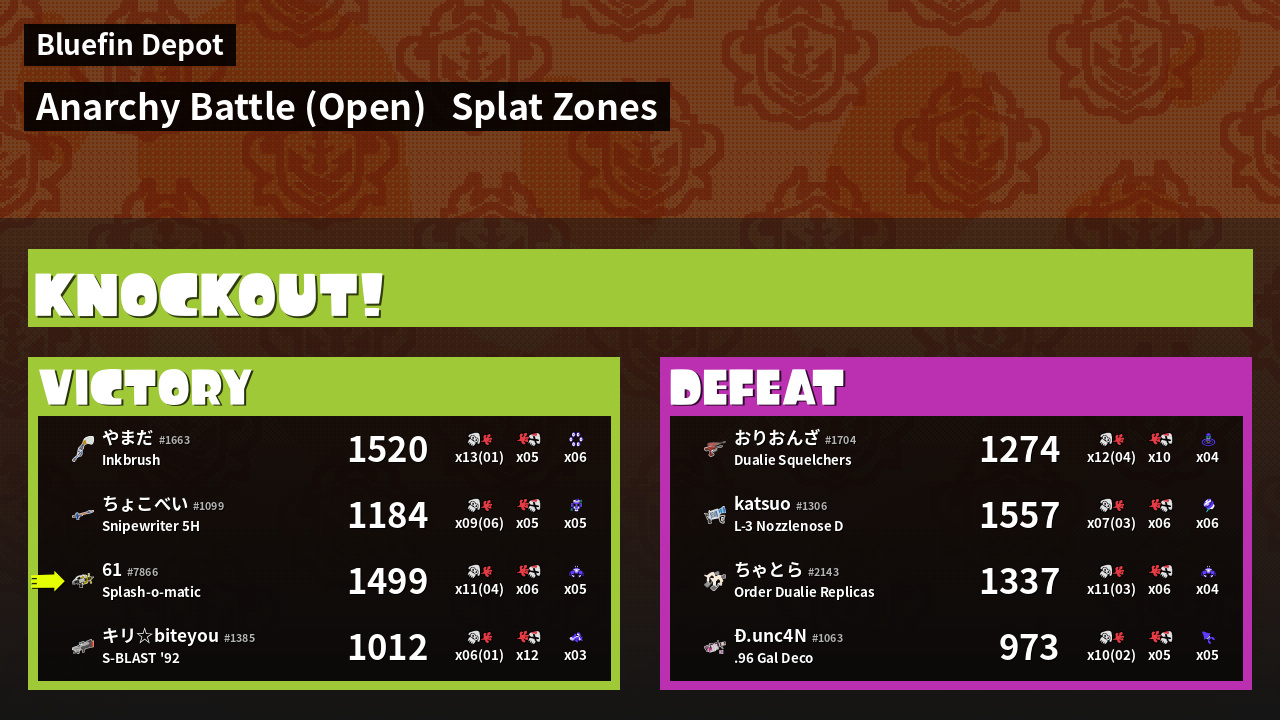 | Name | Weapon | Inked |  k |  d | KR | Sp | |