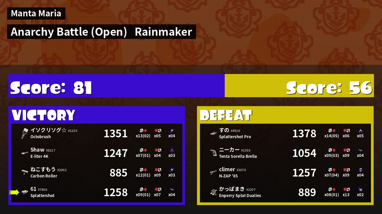 | Mode | Rainmaker - Anarchy Battle (Open) | ||
