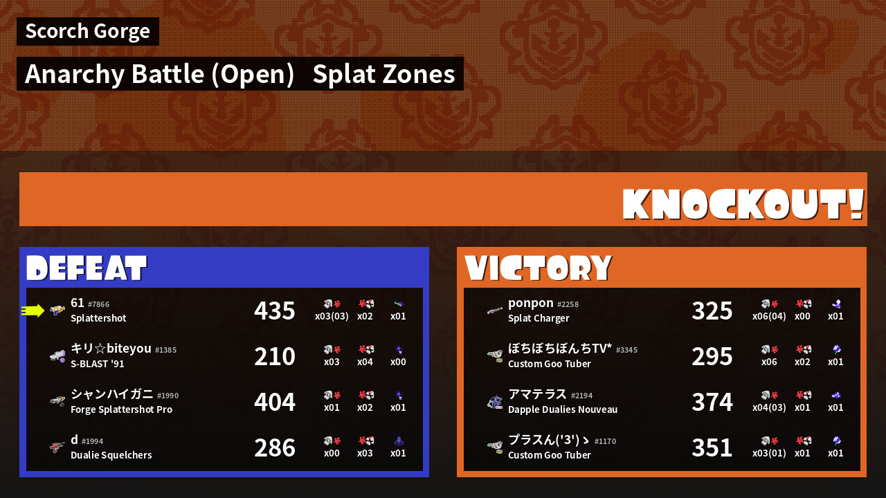 | Mode | Splat Zones - Anarchy Battle (Open) | ||