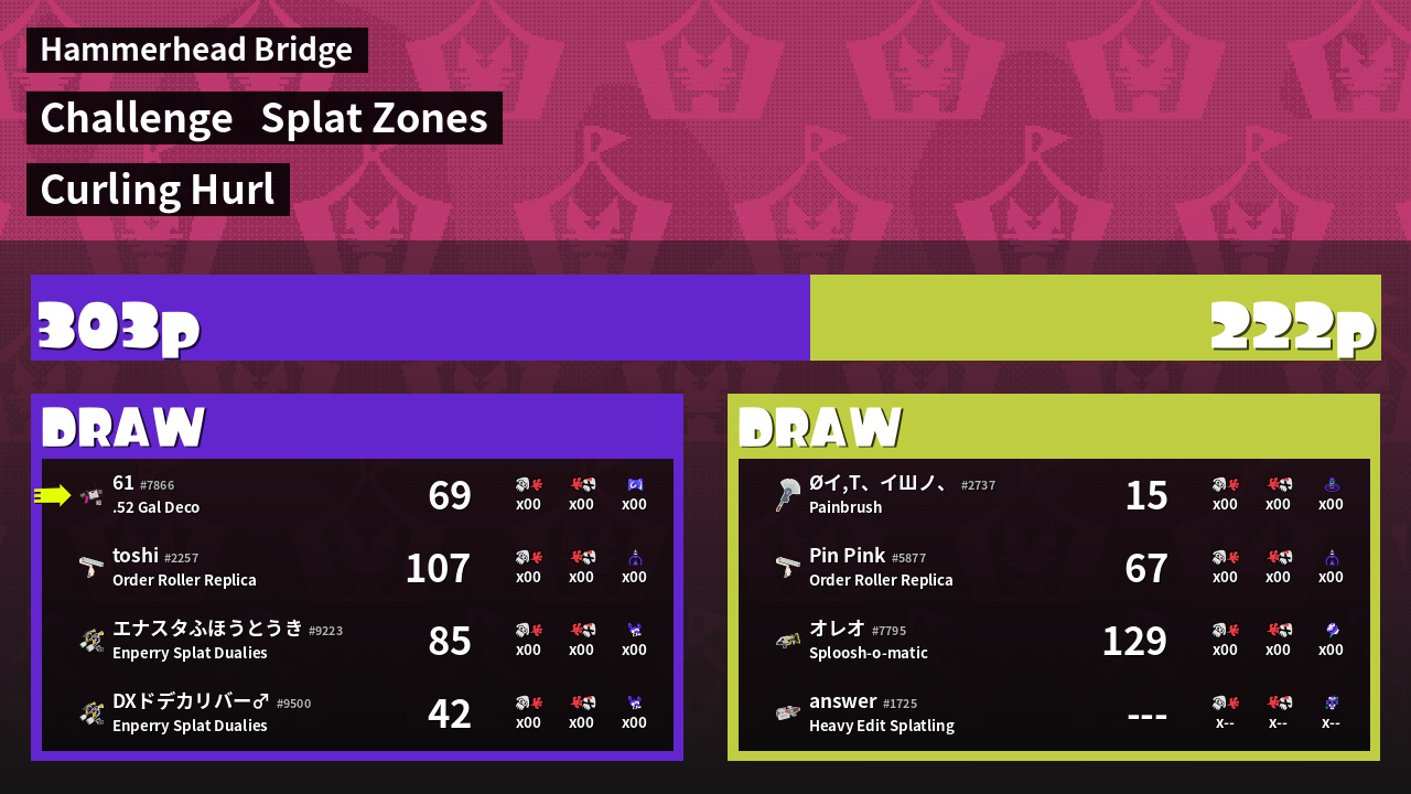 | Weapon | .52 Gal Deco ( Curling Bomb / Splattercolor Screen) | ||