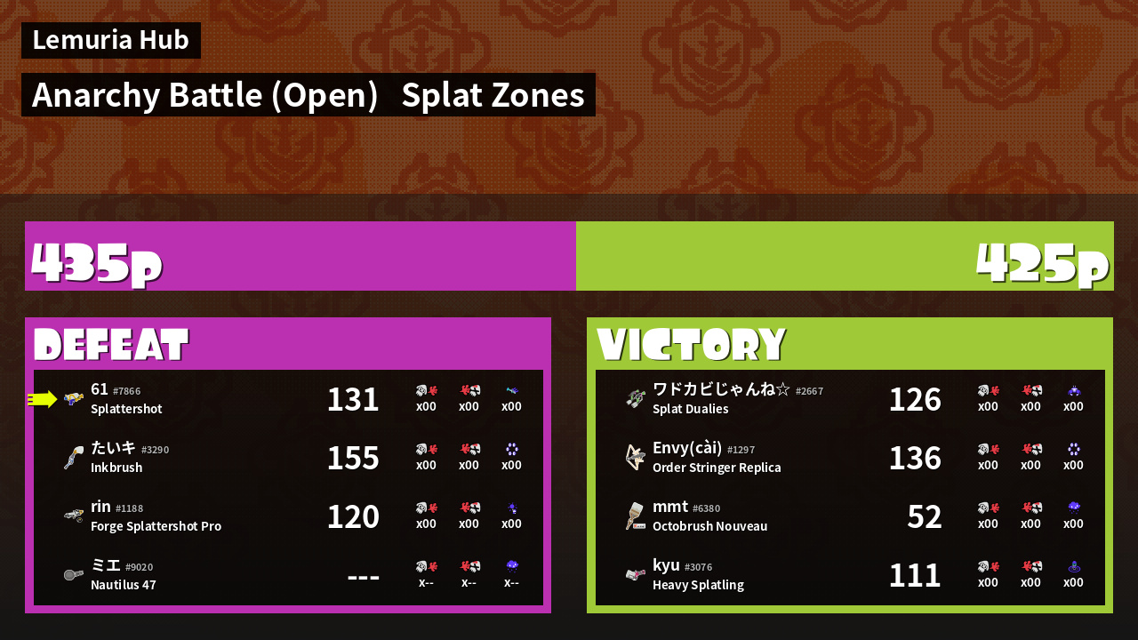 | Mode | Splat Zones - Anarchy Battle (Open) | ||