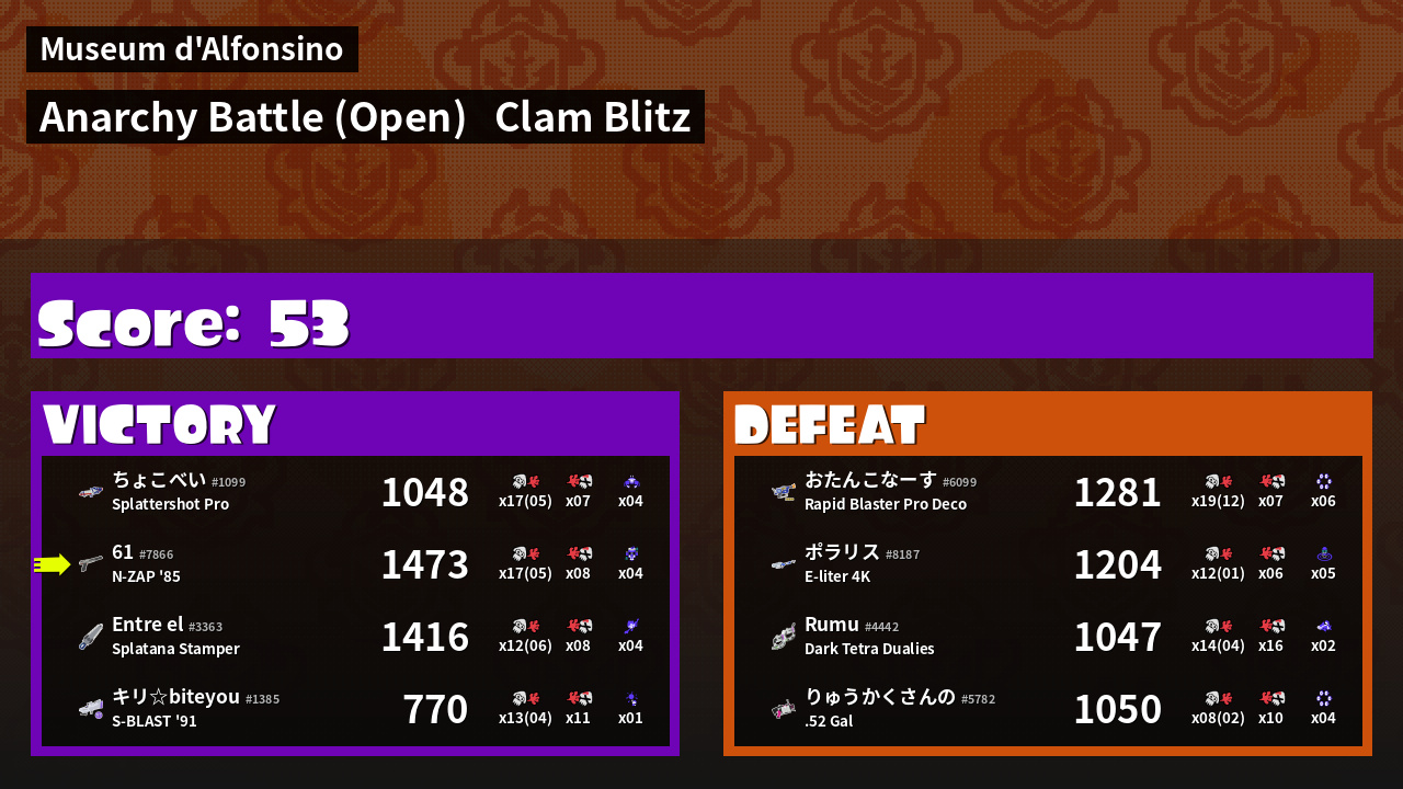 | Mode |  Clam Blitz -  Anarchy Battle (Open) | ||