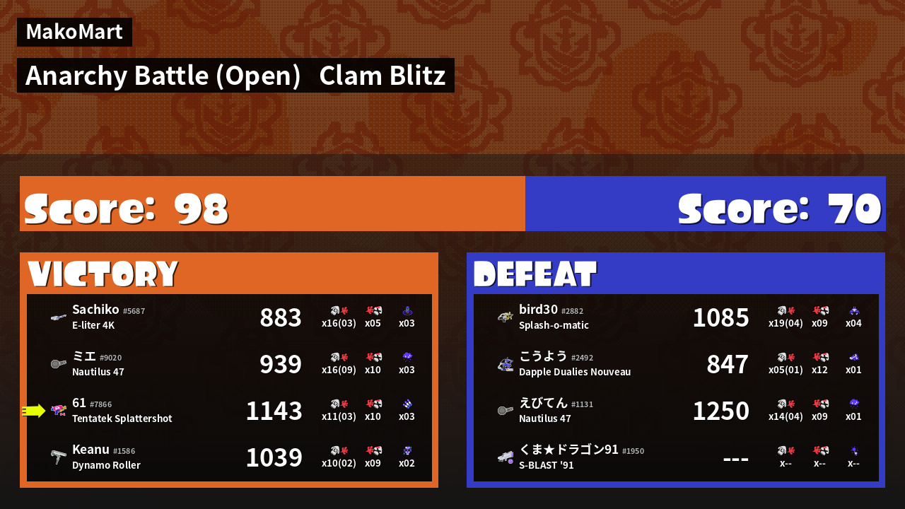 | Mode | Clam Blitz - Anarchy Battle (Open) | ||