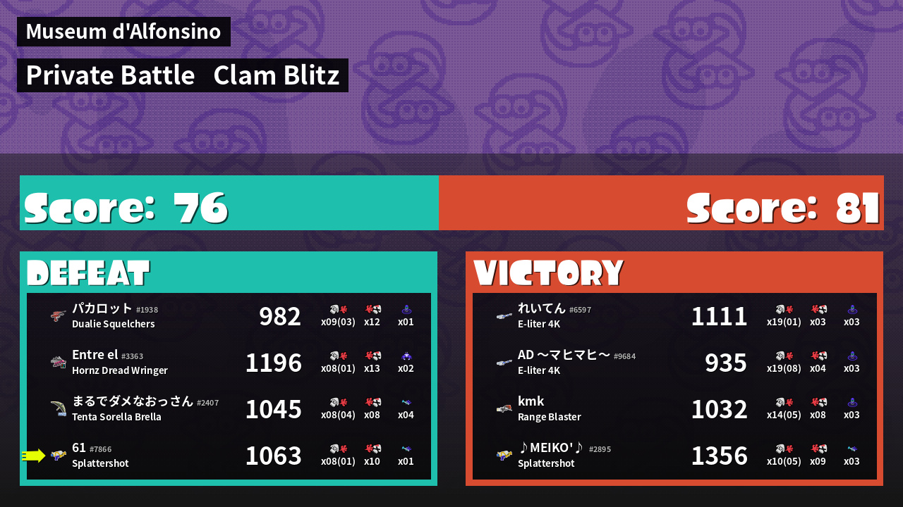 | Mode | Clam Blitz - Private Battle | ||