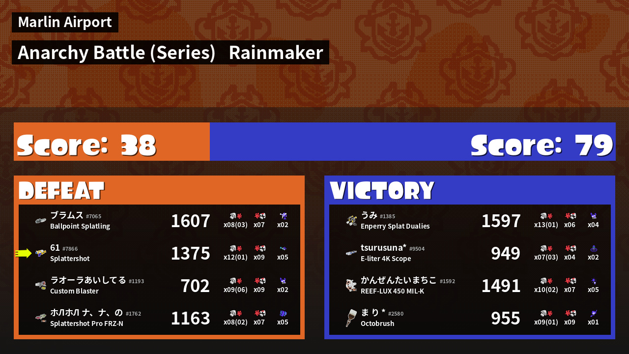| Medals | #1 Overall Splatter #1 Enemy Splatter #1 Rainmaker Stopper | ||