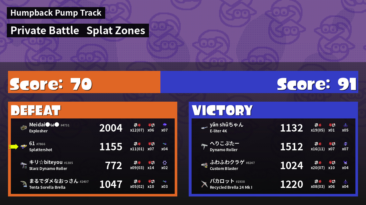 | Mode | Splat Zones - Private Battle | ||