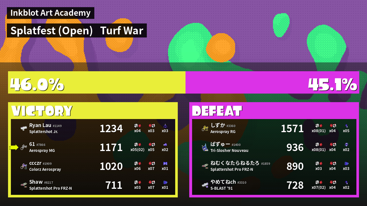 | Medals | #1 Enemy-Base Inker #1 Splat Assister #2 Overall Splatter | ||
